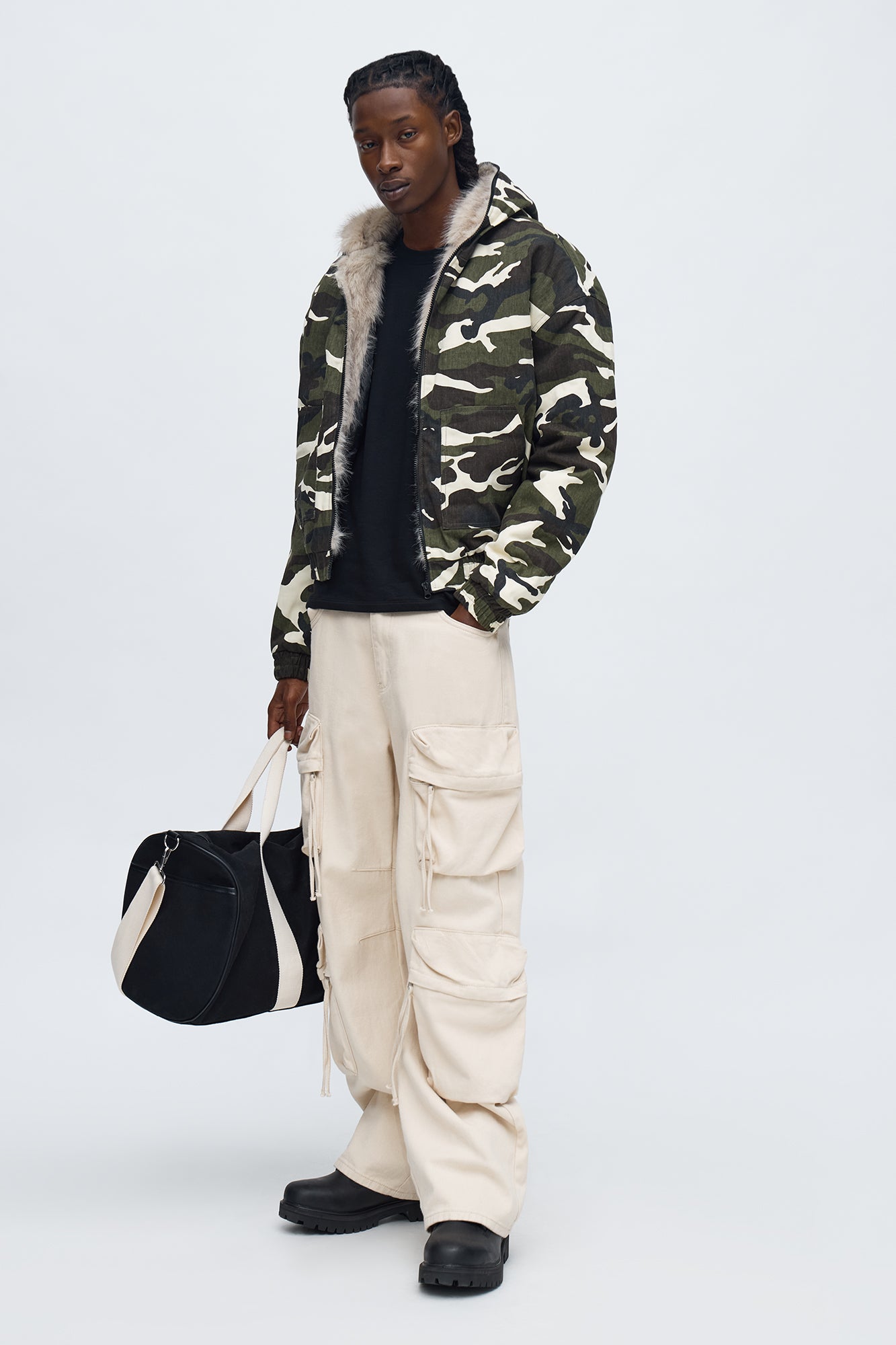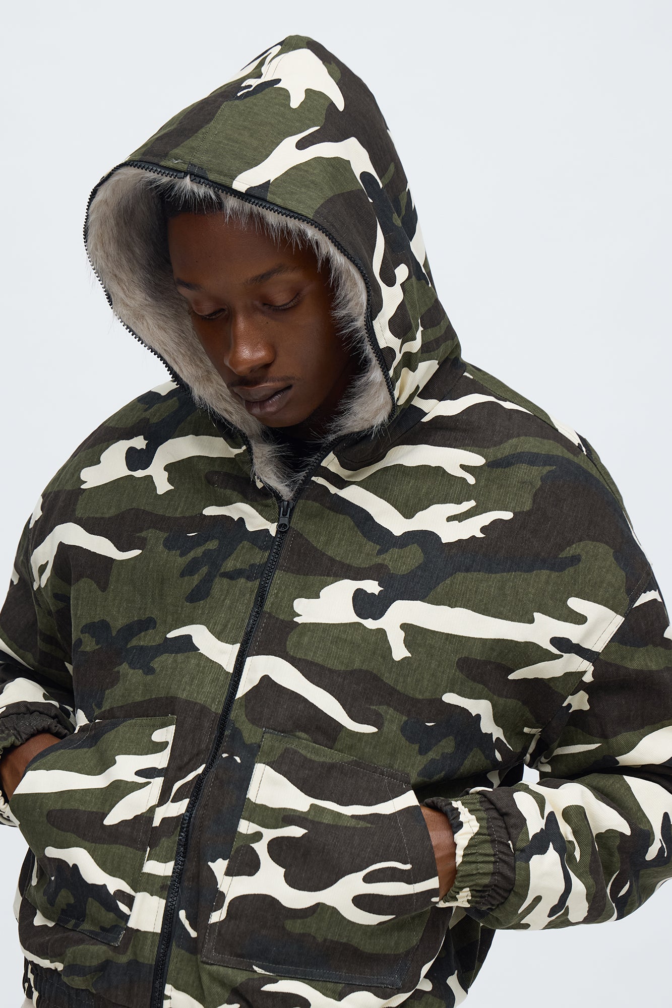 Key features include ribbed cuffs and hem for a secure fit, zippered front pockets for practicality, and an adjustable hood with drawstrings for customizable coverage. The signature rebellion camo pattern blends black and multi-tone camo graphics, delivering an edgy, rebellious vibe that’s both bold and timeless.