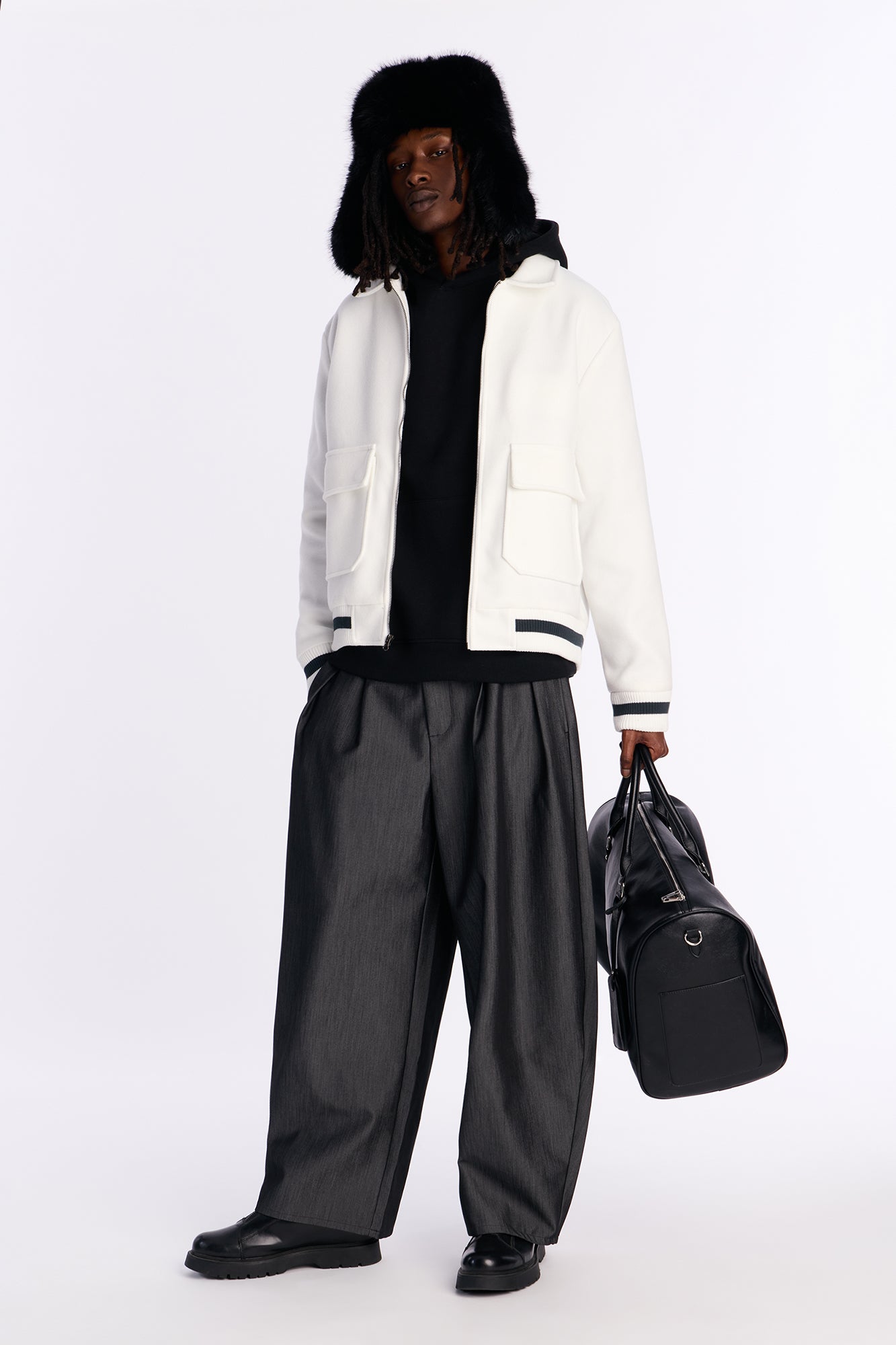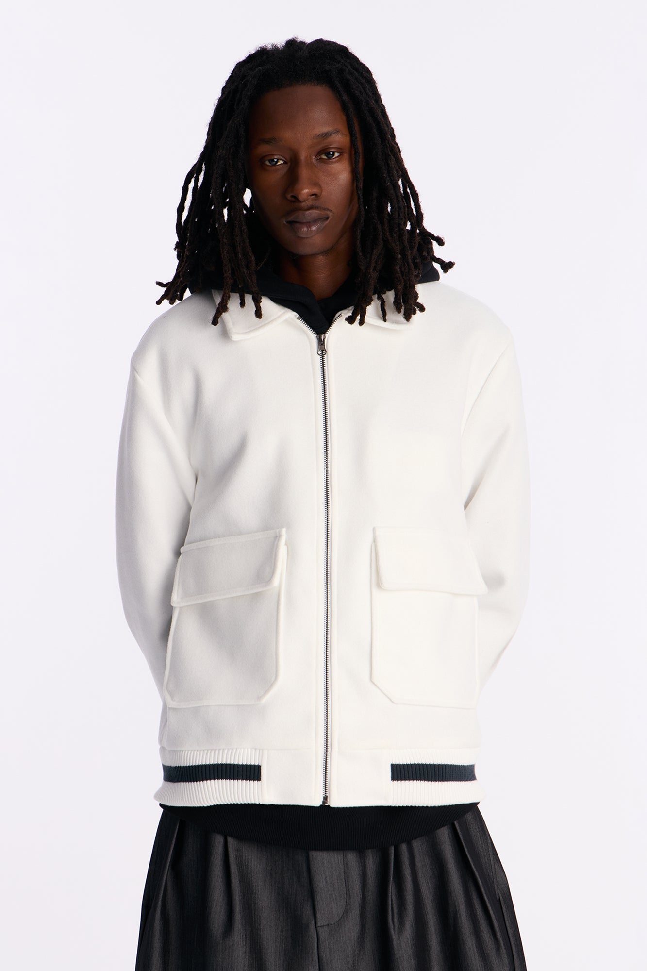 Elevate your streetwear style with the Retro Rib Wool Varsity Jacket in crisp white. Crafted from premium wool blend fabric with signature ribbed collar, cuffs, and hem for a classic varsity silhouette. This retro-inspired jacket features bold contrast stitching, snap-button front closure, and dual slash pockets for everyday functionality. Perfect for layering over hoodies, tees, or flannels during cooler seasons. Ideal for casual outings, sports events, or urban adventures. Available in white to complement any wardrobe. Machine washable for easy care. Embrace timeless athletic fashion with superior comfort and durability.